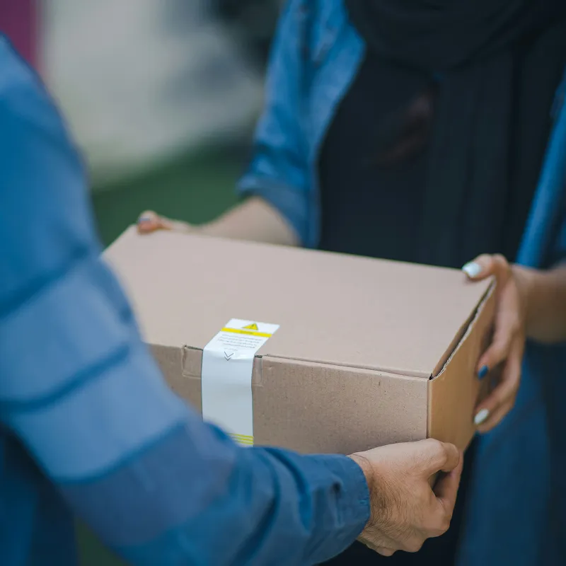 Smiling woman receiving a delivery package from a person in a blue jacket.